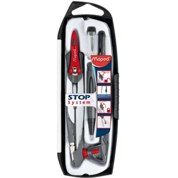 Metalowy cyrkiel z grafitową końcówką w plastikowym etui w zestawie z 4 elementami; uniwersalnym uchwytem na ołówek, zapasowym grafitem, temperówką do grafitów i ołówkiem automatycznym na grafity 0,5 mm. Opatentowany system blokady ramion w określonej pozycji. Specjalna nakładka na igłę zabezpiecza przed skaleczeniem. Jednostka sprzedaży 1 sztuka.