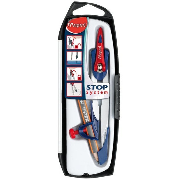 Cyrkiel metalowy STOP SYSTEM w plastikowym etui w zestawie z ołówkiem. Opatentowany system blokady ramion w określonej pozycji. Specjalna nakładka na igłę zabezpiecza przed skaleczeniem. JS 1 szt.