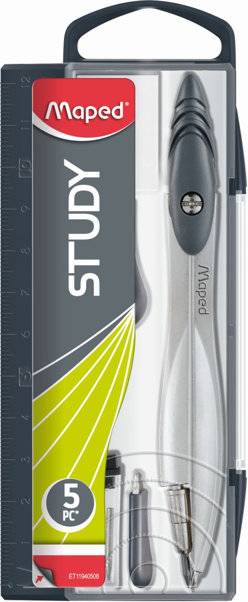 Metalowy cyrkiel STUDY w plastikowym etui z grafitową końcówką, opakowanie zawiera cyrkiel STUDY, wkład grafitowy, temperówkę do grafitów, śrubokręt oraz gumkę. JS 1 szt.