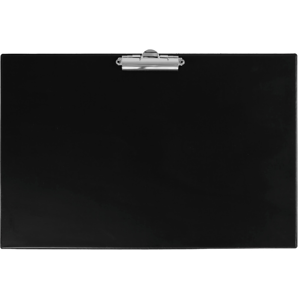 Wykonany z kolorowej folii PVC; środek usztywniony tekturą; wyposażony w sprężysty mechanizm zaciskowy służący do przytrzymywania kartek, umiejscowiony na dłuższym boku; podkładka pojedyncza; format A3;