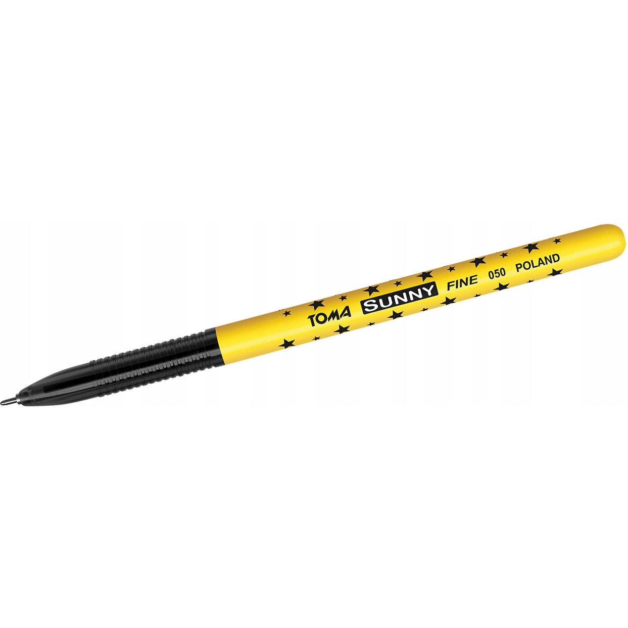 Długopis jednorazowy w plastikowej żółtej obudowie w gwiazdki w kolorze tuszu. Wentylowana nasadka, trwała kulka z węglików spiekanych 0,7mm, cztery kolory tuszu. Nowy wkład do pisania po wszystkich rodzajach papieru, np po odwrotnej stronie druków samokopiujących (faktur).