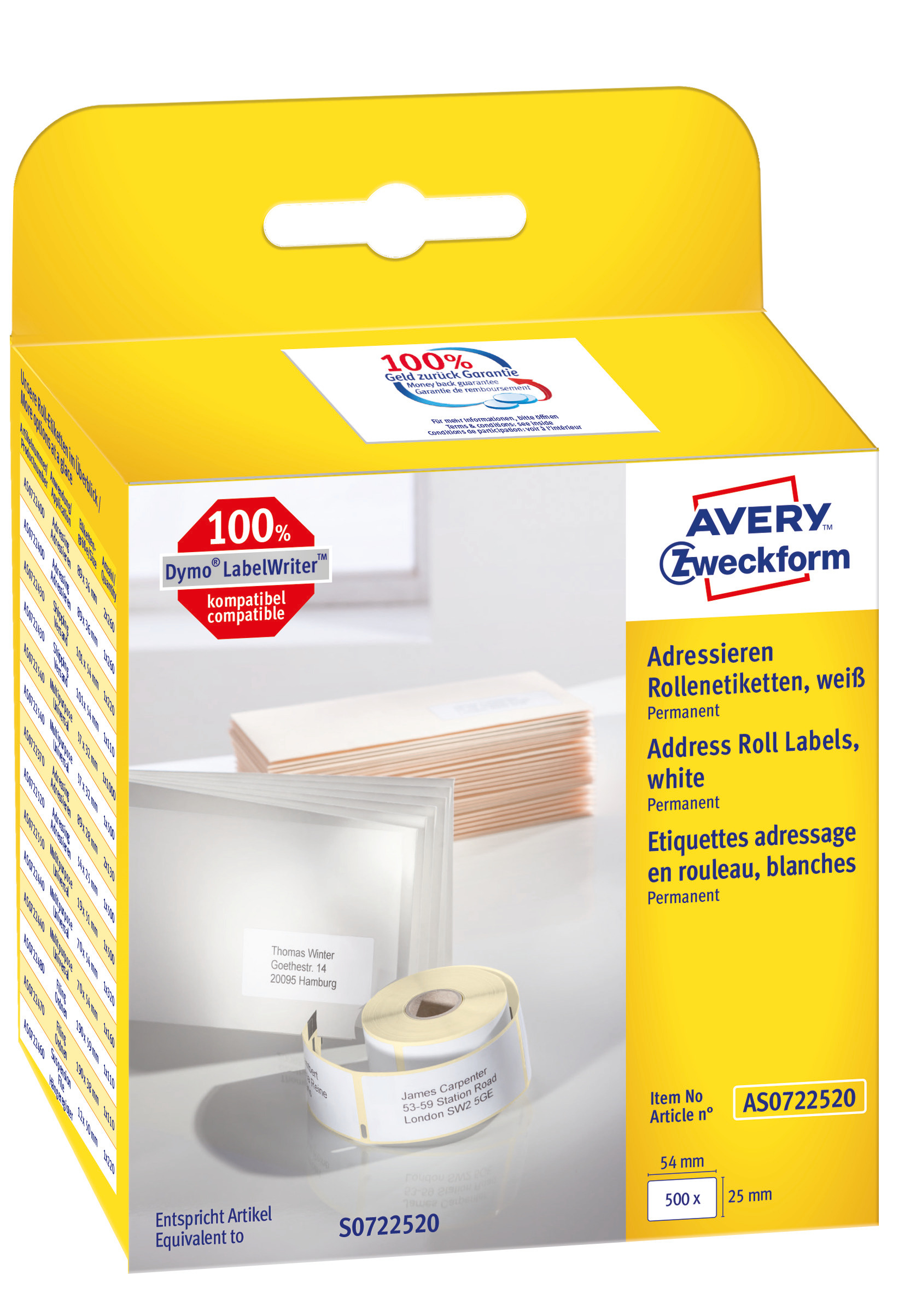 • Etykiety adresowe Avery Zweckform w rolce do drukarek termicznych • Są w 100% kompatybilne z: Dymo LW310; Dymo LW330T, LW400 Seria, LW450 Seria • Rozmiar: 25 x 54 mm • Klej: trwały • 1 rolka/op. • 500 etykiet/rolka • Kolor: białe • Gwarancja niezawodnego zadruku i pewnego przylegania etykiety • Idealne do wydruku oznaczeń wysyłkowych lub kodów kreskowych