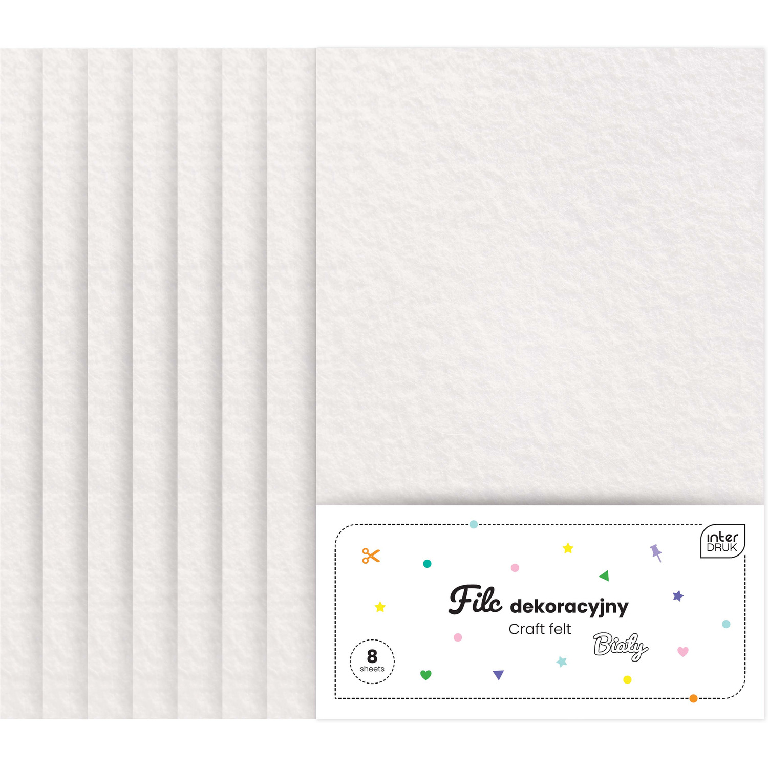 Zestaw filcu dekoracyjnego marki INTERDRUK zawiera 8 arkuszy w kolorze białym, idealnych do wszelkiego rodzaju prac kreatywnych i rękodzielniczych. Każdy arkusz posiada format A4, co zapewnia wygodę podczas wycinania, szycia oraz klejenia różnych elementów dekoracyjnych. Filc wykonany jest z wysokiej jakości włókien syntetycznych, dzięki czemu jest elastyczny, miękki i łatwy w obróbce.