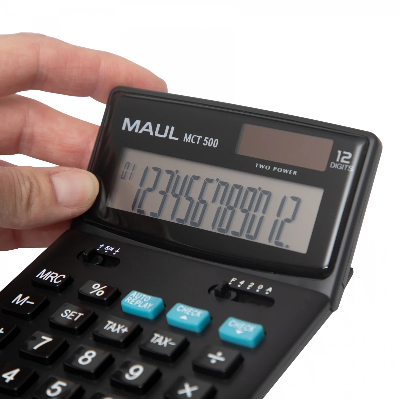 Kalkulator biznesowy MAUL MCT 500 w kolorze czarnym z dużym, 12-pozycyjnym wyświetlaczem LCD. Niezawodny, dokładny i o profesjonalnym wyglądzie. Szybsze wyszukiwanie: przyciski funkcyjne i numeryczne w różnych kolorach. Ergonomiczny: wyświetlacz może być umieszczony na płasko pod kątem dla ułatwionego odczytu. Duży rozmiar i wyraźniejszy wyświetlacz pozwalają na większy komfort pracy. Przyciski z tworzywa sztucznego: wytrzymałe i łatwe do czyszczenia. Z antypoślizgowymi, gumowymi punktami na odwrocie. Energooszczędny, dzięki podwójnemu zasilaniu baterią i baterią słoneczna, z funkcją automatycznego wyłączania. Funkcja sprawdź & popraw - możliwość sprawdzenia i poprawienia obliczeń. Wyposażony w 3 przyciski pamięci, obliczanie procentów, podatków, przycisk z podwójnym zerem. Dodatkowo możliwość automatycznego zaokrąglania w górę lub w dół oraz wyświetlanie cyfr po przecinku. Gwarancja: 5 lat. Wymiary: 17,4 x 10,7 x 2,2 cm. Zawiera jedną baterię (LR1130). Ekologiczne opakowanie z tektury, bez użycia plastiku, z eurozawieszką.