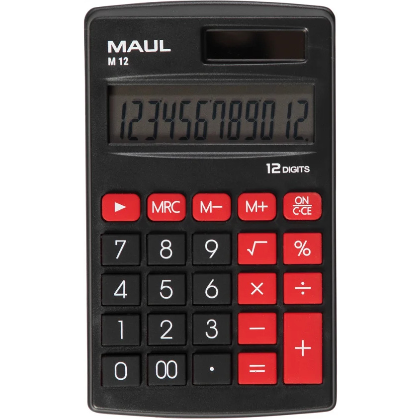 Kieszonkowy kalkulator MAUL M 12 w kolorze czarnym z dużym, 12-pozycyjnym wyświetlaczem LCD. Niezawodny, stylowy i dokładny. Wyjątkowo płaski: mieści się w każdej torbie, teczce, tornistrze czy plecaku. Sprawia, że życie staje się kolorowe! Dostępny w 3 modnych wersjach kolorystycznych. Szybsze wyszukiwanie: przyciski funkcyjne i numeryczne w różnych kolorach. Kompaktowy rozmiar i zaokrąglone krawędzie sprawiają, że dobrze leży w dłoni. Z antypoślizgowymi, gumowymi przyciskami. Energooszczędny, dzięki podwójnemu zasilaniu baterią i baterią słoneczna, z funkcją automatycznego wyłączania. Wyposażony w 3 przyciski pamięci, obliczanie pierwiastków kwadratowych i procentów. Gwarancja: 5 lat. Wymiary: 11,5 x 6,9 x 1,0 cm. Zawiera jedną baterię (LR1130). Ekologiczne opakowanie z tektury, bez użycia plastiku, z eurozawieszką.