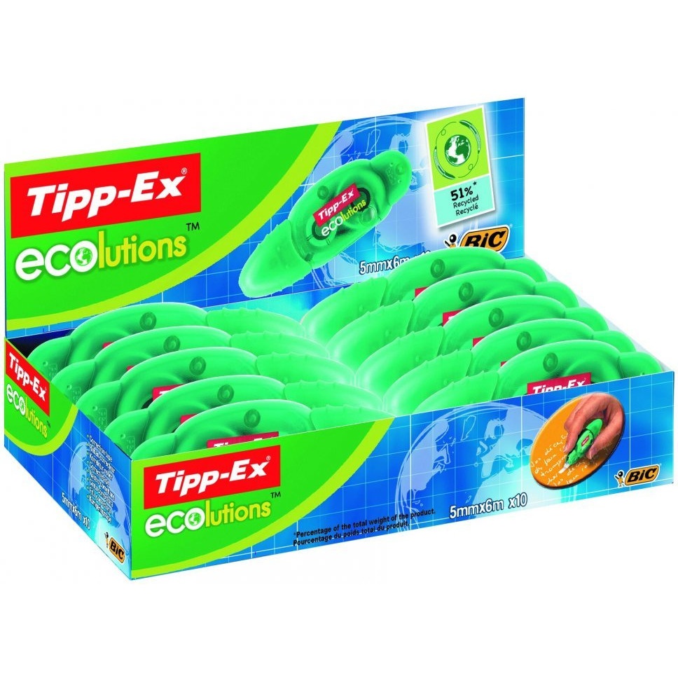 Korektor Ecolutions_ w taśmie __Kompaktowy korektor w taśmie, wykonany w 51%* z tworzyw sztucznych pochodzących z odzysku. Precyzyjna i czysta aplikacja. Mechanizm ponownego nawinięcia taśmy. Ochronna nasadka zabezpiecza taśmę przed zniszczeniem. Odporna na zerwanie taśma poliestrowa. Możliwość natychmiastowego pisania po korygowanej powierzchni. Długość taśmy: 6 m. Szerokość taśmy: 5 mm. __*Udział procentowy w łącznej wadze produktu.