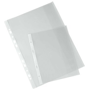 Miękka, mocna groszkowa folia PVC; z prawej strony posiada klapkę chroniącą dokumenty przed wypadaniem; boczna perforacja umożliwia wpięcie do segregatora z dowolnym ringiem;