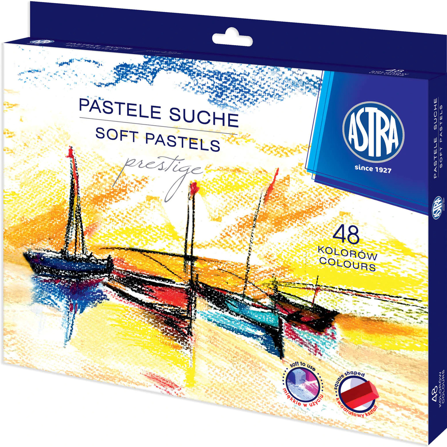 Pastele suche o kwadratowym przekroju są wykonane z wysokiej jakości pigmentów zmieszanych z najlepszej jakości glinką kaolinową. Mają żywe, świetliste i trwałe kolory. Dobrze przylegają do podłoża. Pastele suche służą do rysowania cienkich linii, delikatnych śladów lub malowania szeroką smugą. Można je rozcierać i nawarstwiać uzyskując delikatne przejścia pomiędzy barwami. Struktura pasteli, szeroka paleta barw oraz wyrazistość kolorów pozwala uzyskać aksamitną gładkość oraz ciekawe efekty wizualne. Foliowa owijka zabezpiecza przed brudzeniem rąk.