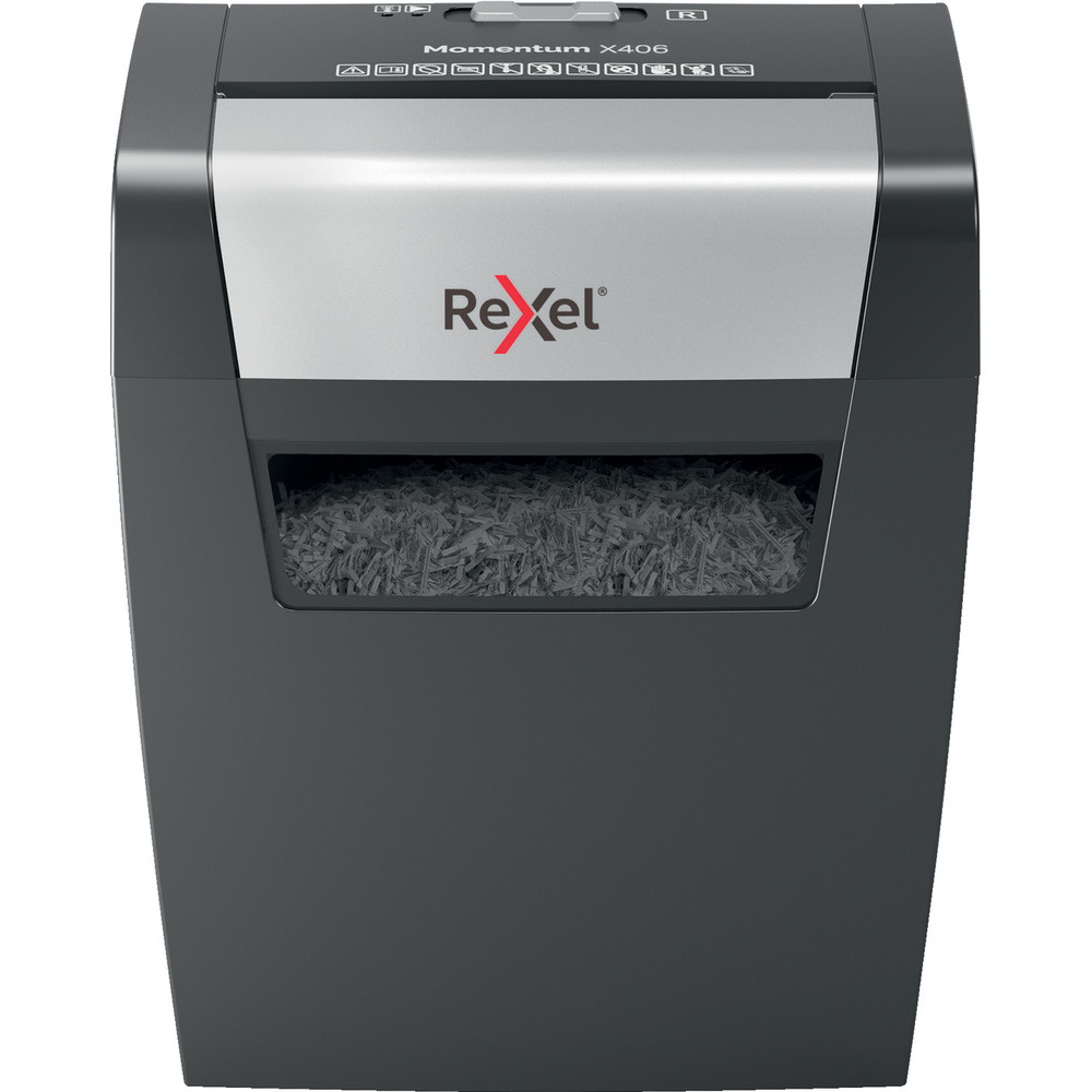 Posiada moc, aby niszczyć więcej! Niszczarka Rexel Momentum X406 niszczy do 6 kartek jednocześnie i może pracować nieprzerwanie przez 3 minuty - idealnie nadaje się do użytku domowego. Tnie na konfetti 4 x 28 mm, gwarantując tym bezpieczeństwo na poziomie P4. Posiada 15-litrowy pojemnik na ścinki, który mieści do 125 kartek A4.