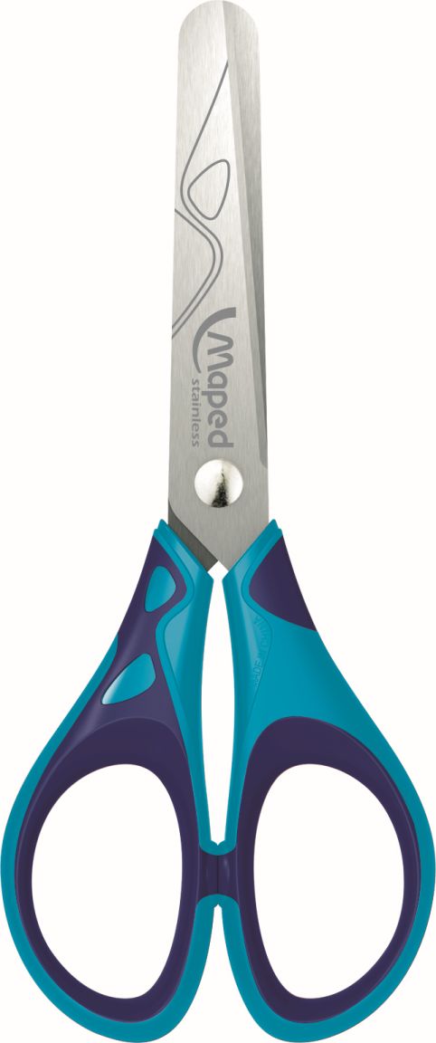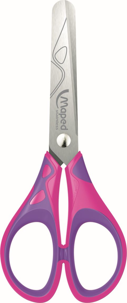 Nożyczki szkolne wykonane ze stali nierdzewnej. Grawerowane ostrza z zaokrąglonymi końcami - średnica 10 mm. Plastikowe uchwyty, miękkie w środku, profilem dostosowane do dziecięcej dłoni. Długość 13 cm. Miks 3 kolorów; niebiesko-granatowe, czerwono-czarne i różowo-fioletowe.