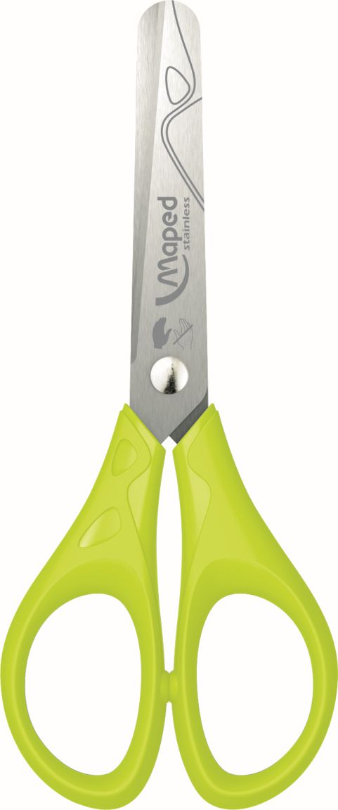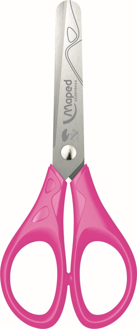 Nożyczki szkolne wykonane ze stali nierdzewnej dla prawo i leworęcznych. Grawerowane ostrza z zaokrąglonymi końcami - średnicy 10 mm. Plastikowe uchwyty profilem dostosowane do dziecięcej dłoni. Długość 13 cm. Miks 3 kolorów; niebieskie, zielone i różowe. JS 24 szt.