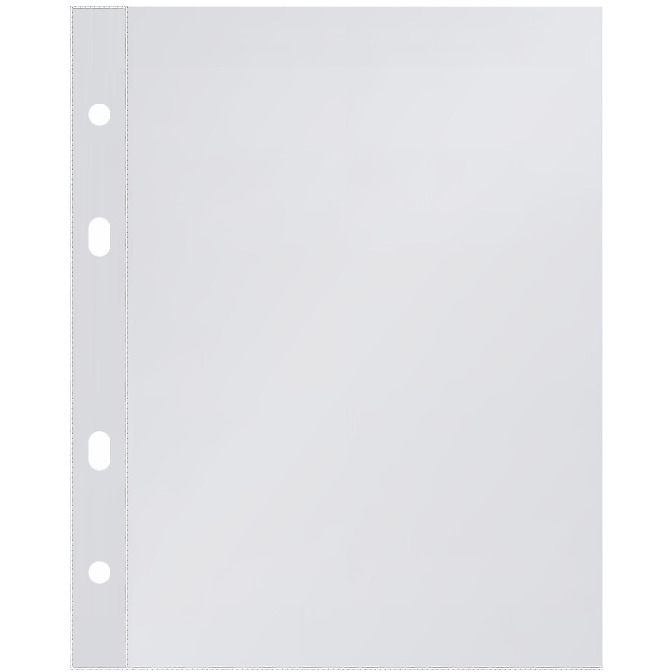 Przód i tył z przezroczystej twardej folii PVC typu 0,15; zgrzew w kształcie litery "L"; boczna perforacja umożliwiająca wpięcie do segregatora z dowolnym ringiem;