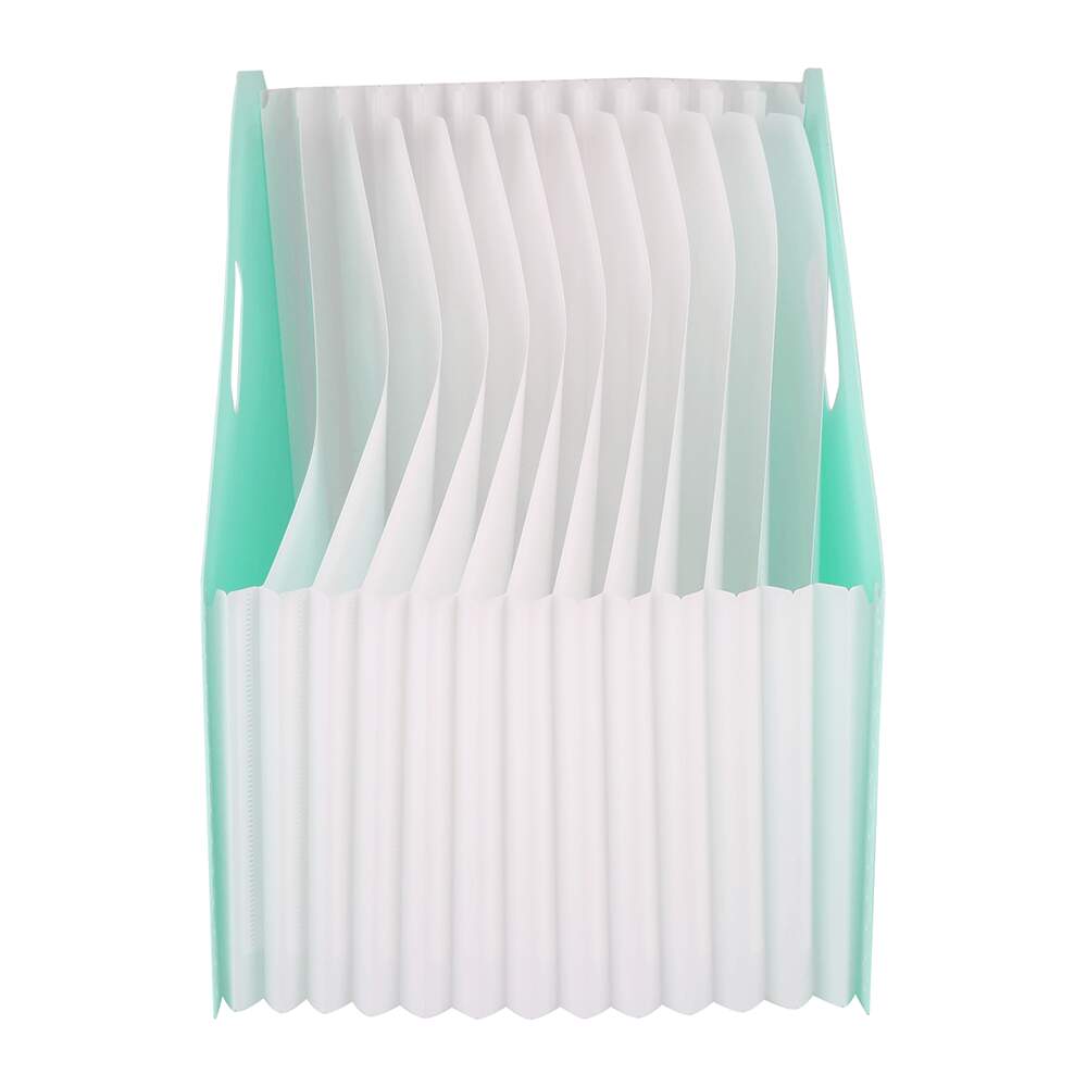 Pastelowy Organizer na biurko z systemem harmonijkowym, występujący w kolorze zielonym. Dzięki temu, że produkt ma system harmonijkowy doskonale sprawdzi się w małych pomieszczaniach – podczas nie użytkowania go zajmuje mało miejsca w szufladzie i można go złożyć do naprawdę małych rozmiarów.