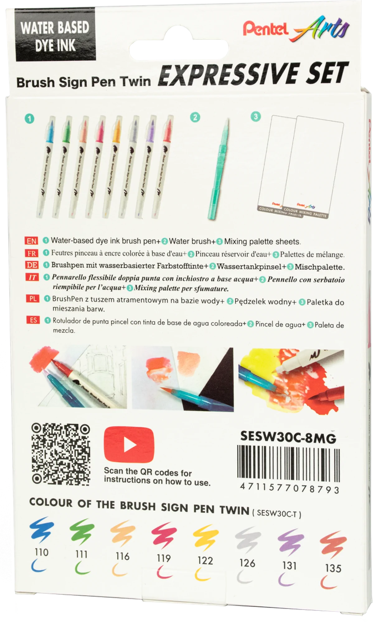 • 8 dwustronnych pisaków pędzelkowych – cienka końcówka do precyzyjnych detali i pędzelkowa do płynnych, ekspresyjnych pociągnięć.
