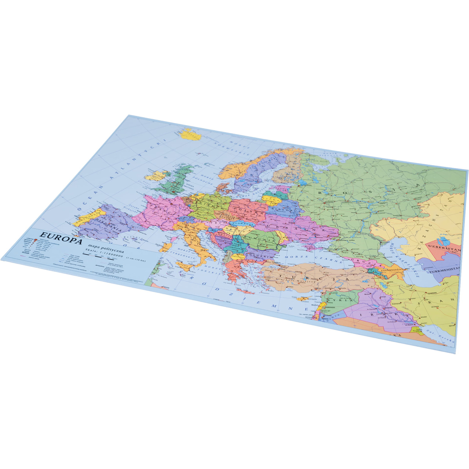 Podkład na biurko z grafiką mapy Europy wykonany jest z litej tektury o grubości 2 mm. Wytrzymałość, trwałość, sztywność to kluczowe cechy tego produktu, dzięki którym idealnie sprawdza się jako podkład na biurko. Dodatkowo umożliwia zapoznanie się z rozmieszczeniem geograficznym państw w Europie. Podkład jest obustronnie lakierowany w celu uszlachetnienia i zabezpieczenia powierzchni zewnętrznej. Format 550x380 mm.
