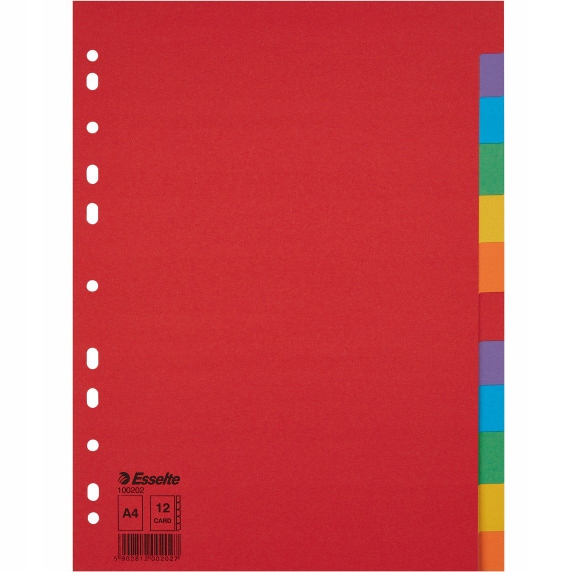 Najwyzszej jakości, wytrzymale przekladki Esselte, utrzymane w zywej tonacji kolorystycznej. Wykonane z kartonu pochodzącego z odzysku, posiadają certyfikat Blue Angel.