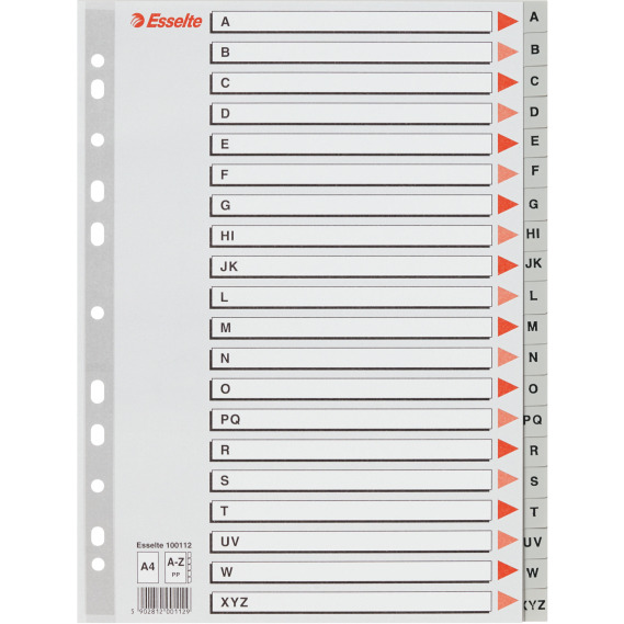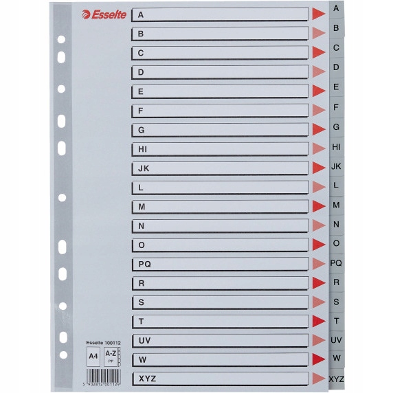 Wysokiej jakości przekladki plastikowe Esselte w kolorze szarym. Wierzchnia karta z wydzielonymi, duzymi powierzchniami na opisy.