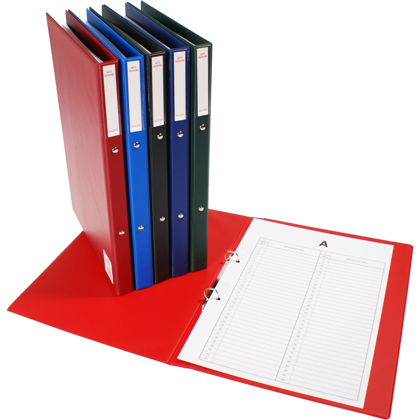 Wykonana z kolorowej folii PVC; zamek: 2 ringi typ R; w środku uniwersalne przekładki A, B, C i D bez opisu kategorii; na grzbiecie kieszeń z kartonikiem do opisu;