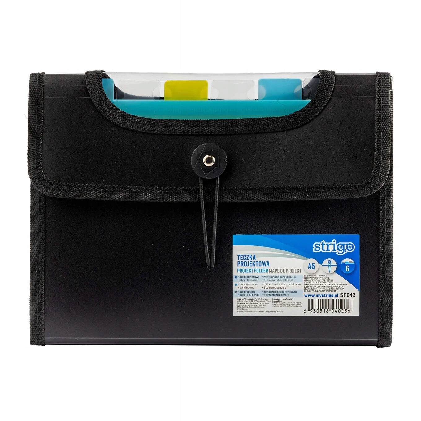 Czarna teczka VFILE STRIGO w formacie A5 posiada 6 kolorowych przekladek z indeksem i miejsce na wsuniecie np.: karteczki z informacją.