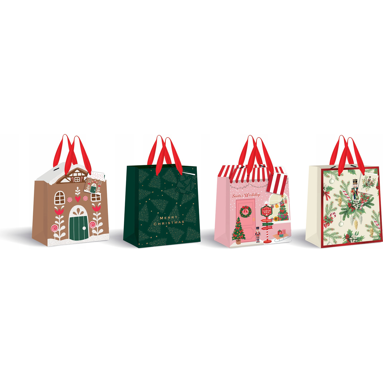 Każda torba zdobiona jest pięknym motywem bożonarodzeniowym – kolorowe wzory nawiązujące do świątecznych zabawek, prezentów i magicznej atmosfery Świąt Bożego Narodzenia.