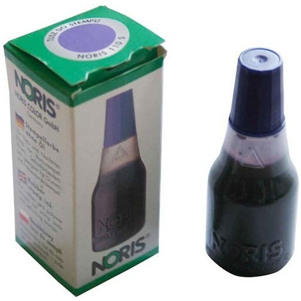 Uniwersalny tusz wodny Noris 110S _- do stempli ręcznych i samotuszujących, z gumową i polimerową płytką stemplującą. - Dostępny w kolorach: czarnym, czerwonym, niebieskim, zielonym i fioletowym. - Buteleczka 25 ml z końcówką ułatwiającą nasączenie poduszek oraz nakrętką w kolorze tuszu.- jednostka sprzedaży 1 sztuka