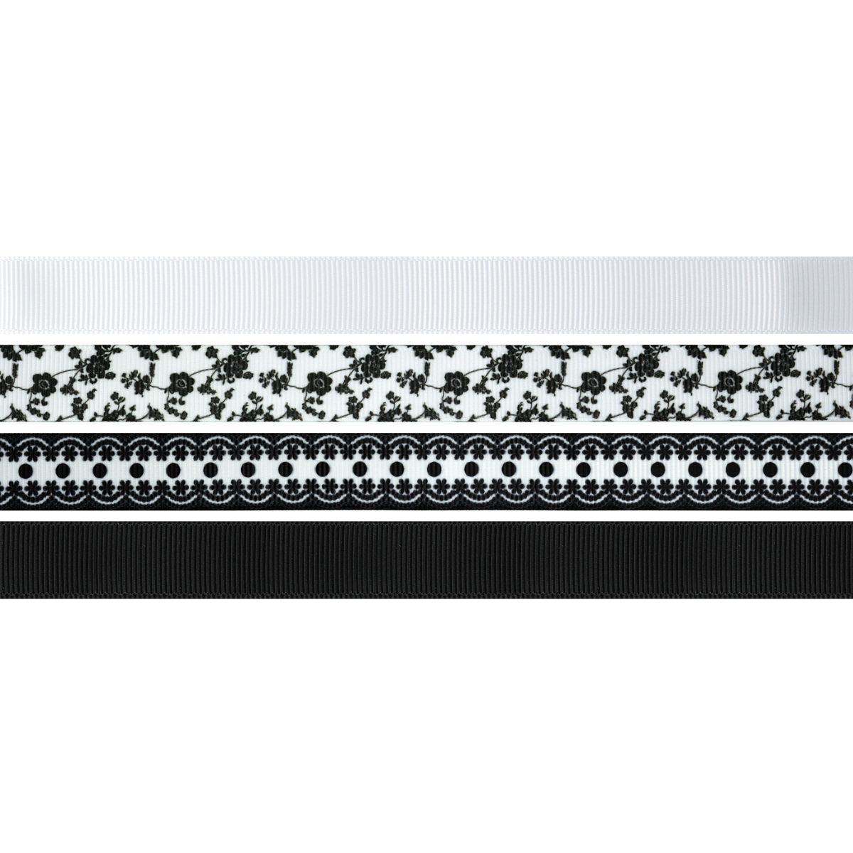 Zestaw wstążek materiałowych. 4 kolory z nadrukiem, szerokość wstążki: 16 mm, długość każdej wstążki: 1 m, wzory: gładkie (biała, czarna), kwiaty, koronka.