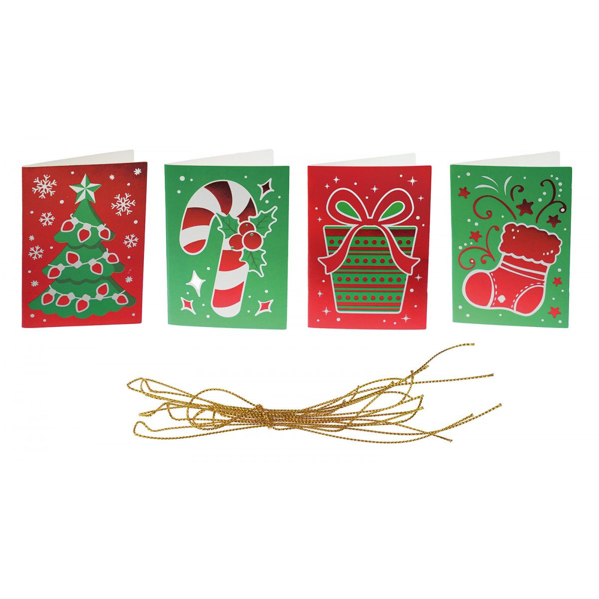 Karnety prezentowe, wzór: Boże Narodzenie, wymiary: 50 x 70 mm, 4 wzory metalizowane: choinka, cukrowa laska, prezent, skarpeta. 8 sztuk + sznureczek 1,5 m.