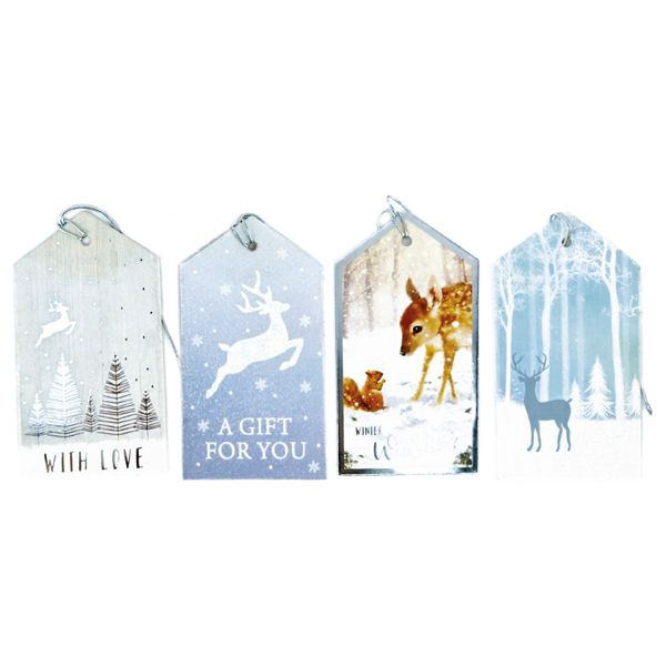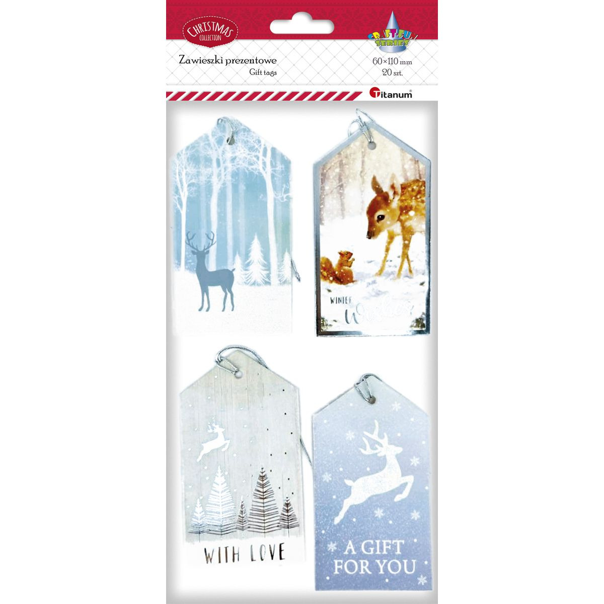 Zawieszki do prezentów wykonane z kartonu. W każdej zawieszce jest wycięty otwór na dowieszenie sznureczka. Tylna strona zawieszki nie posiada nadruku. Tonacja srebrna, wymiary zawieszki: 60 x 110 mm. 20 szt.