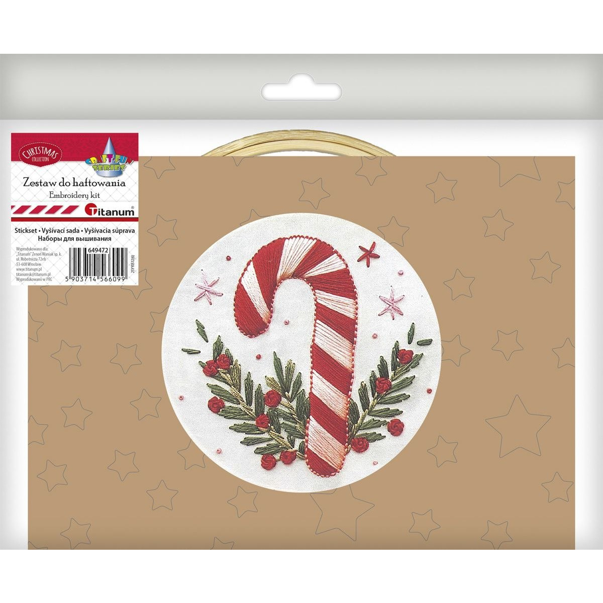 Gotowy zestaw do haftowania, zawierający: tkaninę 24x24 cm ze szkicem wzoru, tamborek o średnicy roboczej 15 cm, zestaw mulin, 3 igły, instrukcję w języku polskim.