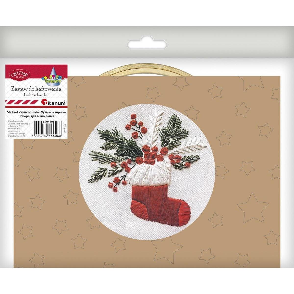 Gotowy zestaw do haftowania, zawierający: tkaninę 24x24 cm ze szkicem wzoru, tamborek o średnicy roboczej 15 cm, zestaw mulin, 3 igły, instrukcję w języku polskim.