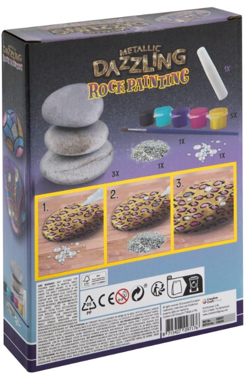 Zawartość fantastycznie nadaje się do udekorowania kamieni i stworzenia z nich istnych dzieł sztuki. Na kamienie można nakleić naklejkę załączone kryształki lub namalować cokolwiek dziecko sobie wymyśli. Wymiary pudełka: 16 x 21 x 4 cm. Odpowiedni dla dzieci w wieku od 5 lat.