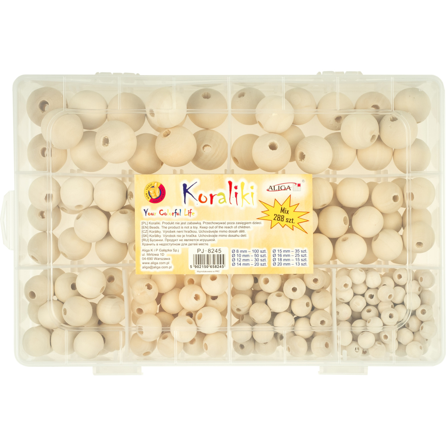 Zestaw 288 szt. koralików drewnianych w zamykanym pudełku: 8 mm, otwór 3 mm – 100 szt. 10 mm, otwór 3,5 mm – 50 szt. 12 mm otwór 4 mm – 30 szt. 14 mm otwór 4 mm – 20 szt. 15 mm otwór 4 mm – 35 szt. 16 mm otwór 4 mm – 25 szt. 18 mm otwór 4 mm – 15 szt. 20 mm otwór 4,5 mm – 13 szt.