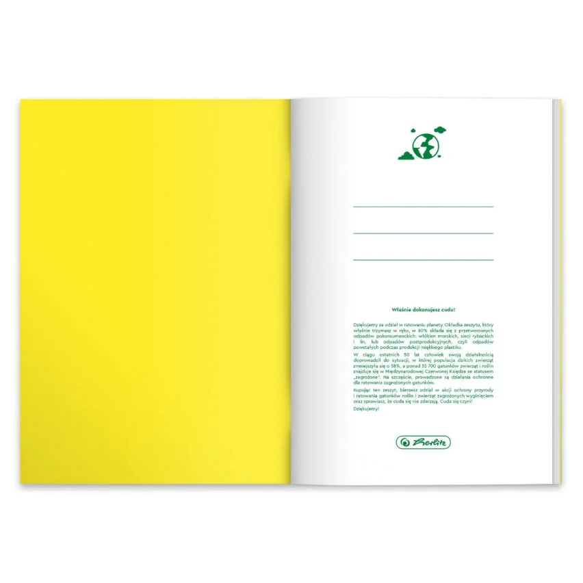 Kolekcja ECO PP Colors Produkt z certyfikatem FSC Okładka: wysokiej jakości polipropylen w jednolitym, soczystym kolorze, bardzo dobrze zabezpiecza wnętrze, 80% użytego surowca na okładkę pochodzi z recyclingu poprodukcyjnego, okładka w 100% podlega recyclingowi. Elementy dodatkowe: Strona tytułowa z etykietą do wpisania danych. Specyfikacja: Format: A5 Ilość kartek: 60 Grubość kartek: 70 g/m2 Liniatura: niebieska kratka + zielony margines