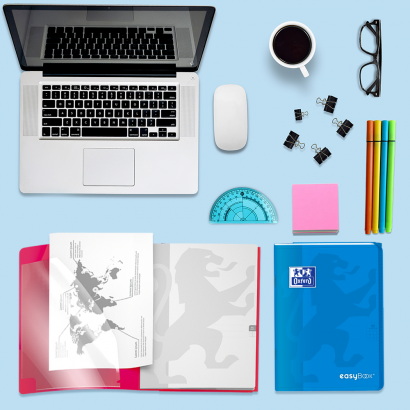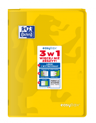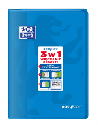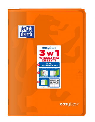 Kolekcja Easybook to zeszyty z półprzezroczystą, trwałą polipropylenową okładką oraz przedstawionym wizerunkiem lwa. Na przodzie zeszytu bardzo praktyczna kieszeń na luźne kartki, natomiast na końcu zeszytu teczka na dokumenty, której skrzydło służy również jako zakładka. Śnieżnobiały i idealnie gładki papier Optik Paper o gramaturze 90 g/m2 sprawi, że pisanie w zeszycie będzie przyjemnością.